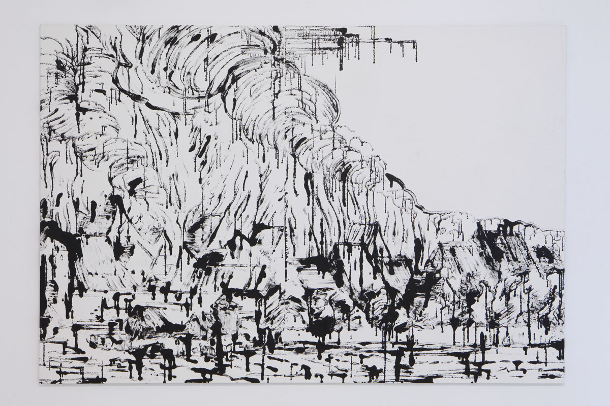 Lange Rauchwolken aus schwarzen geschwungenen Linien ziehen sich über den Großteil des Bildes. An einigen Stellen läuft die schwarze, im Fluss getrocknete, Farbe zusammen. Bei genauerem Hinsehen weisen die vermeintlichen Pinselstriche eine eigenartige, gar Pixel–ähnliche, Struktur auf.